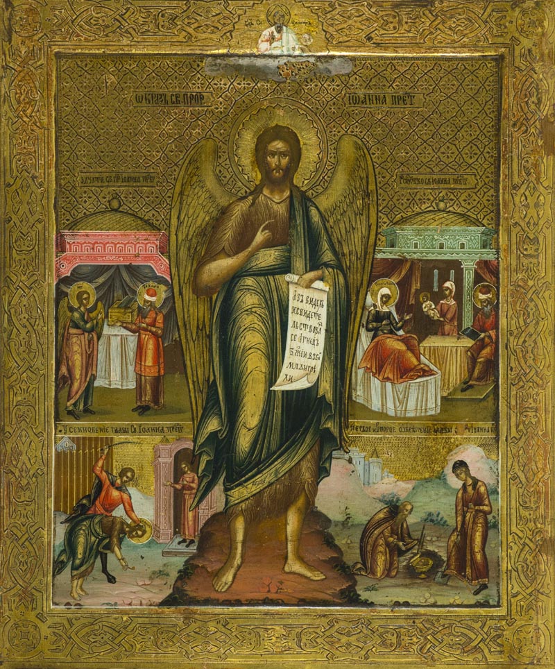 Icona Russia Centrale - Mosca seconda meta '800 , - , San Giovanni il Precursore con scene della vita , Tavola, gesso, oro in foglia, tempera all'uovo, crisografia, cm. 44,5x37,5. Ottimo stato di conservazione e qualità pittorica. , , Esposizione: Icone Russe, Museo delle Icone Russe "F. Bigazzi", Peccioli, Pisa per l'Arte La Cultura e la Solidarietà, dalla collezione di Margherita Maka in collaborazione con Antichità Retrò, 2006, pubblicato sul catalogo della mostra.,