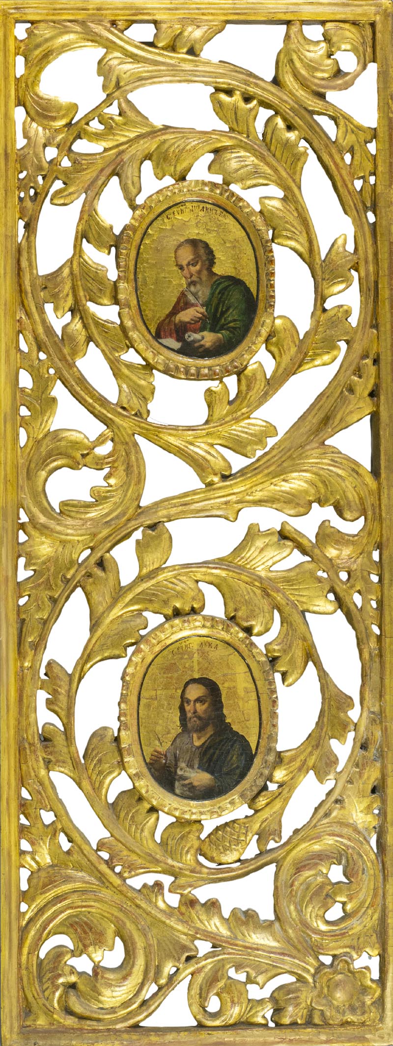 Icona Russia Centrale metà '700, - , Porta regale, con Evangelisti Giovanni e Luca , Legno,oro in foglia, tempera all'uovo cm 111 x 42 . Fa' parte di una porta regale dell'iconostasi; riccamente intagliata in legno in motivi di fogliame con doratura a foglia., , ,