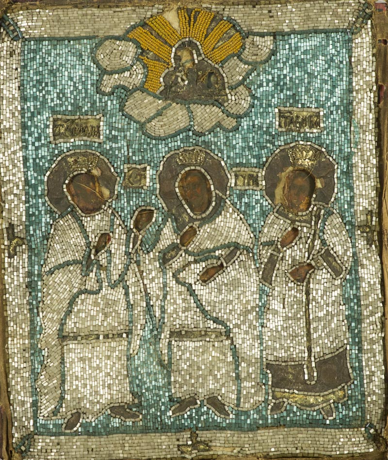 Icona Russia San Pietroburgo primi '800, - , Santi Smuna, Gurija e Habib con oklad di perline in vetro , Tavola, gesso, tempera all'uovo, stoffa ricamata con le perline di vetro cm. 34,5x29., , ,