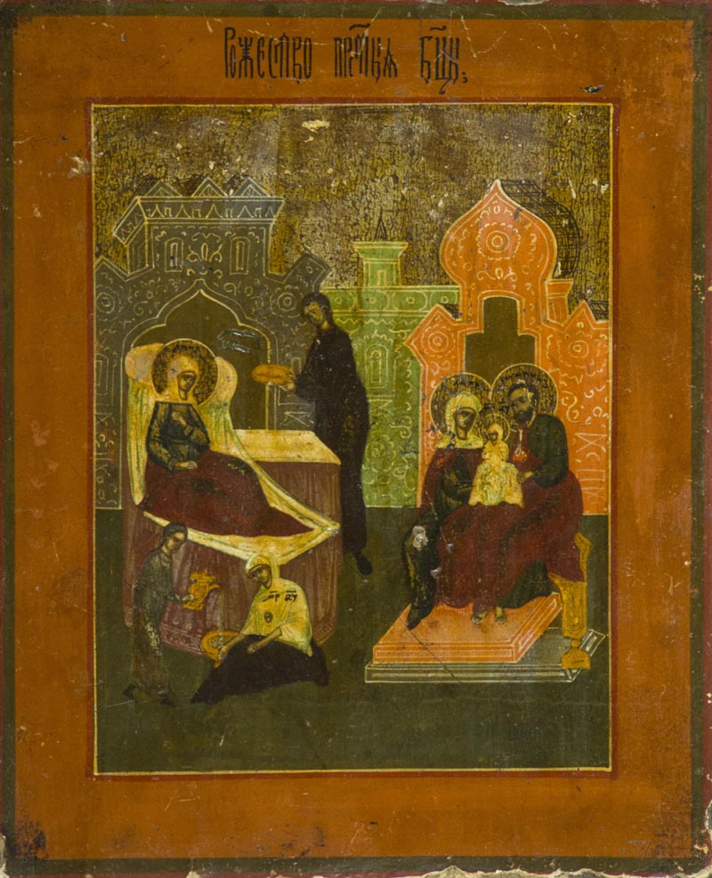 Icona Russia villaggi zona governatorato di Vladimir ultimo quarto'800 , - , Natività della Vergine , Tavola, gesso, tempera all'uovo, cm. 26,8x21,8. Una delle principali festività ortodosse., , ,