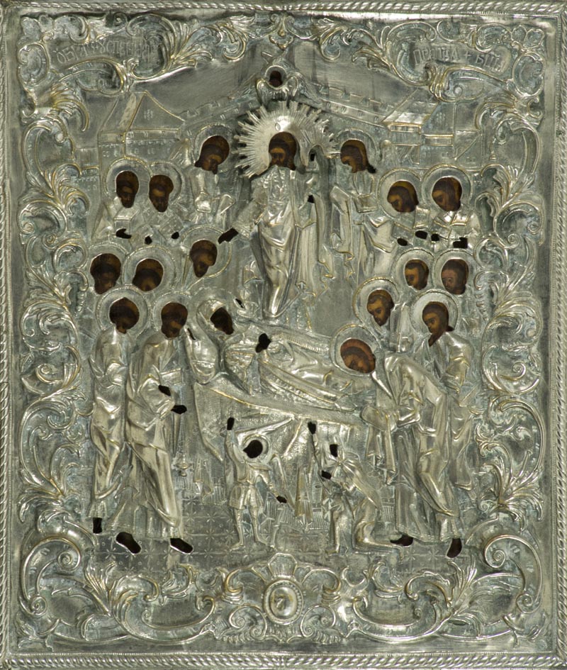Icona Russa 1860, - , Dormizione della Madre di Dio , Tavola, gesso, tempera all'uovo, oklad in ottone argentato cm. 30,8x25,2. Molto decorativa e rara, datata la tavola e oklad. Bellissimo oklad lavorato repoussè con gli ornamenti di fogliame. Il retro della tavola porta una scritta in cirillico antico e la data 1860.Oklad in basso porta la data 1861., , ,
