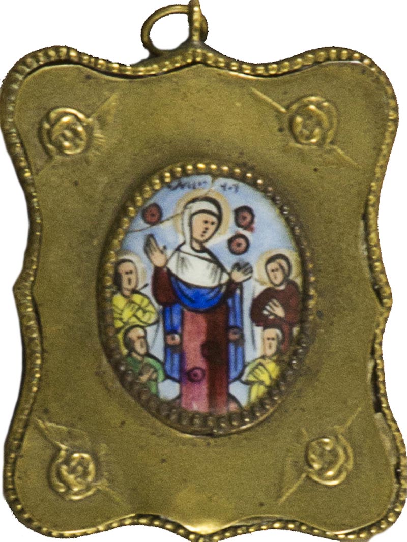 Icona Russia - Rostov seconda metà '800, - , Finift Madre di Dio Gioia di tutti gli afflitti , Ottone, smalti policromi, cesellatura, cm. 5x3,5. Una piccola icona pettorale con la Madre di Dio Gioia di tutti gli afflitti, una delle immagini più venerate in Russia con i cherubini all'estremità., , ,