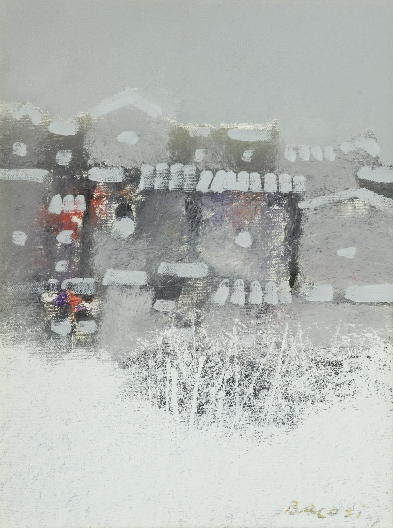 Manlio Bacosi, Perugia 1920 - Perugia 1995, Nevicata , Olio su tela, cm, 40x30, Firmato in basso a destra; Sul verso: Etichetta e Timbri Galleria d'Arte "Le chiavi d'oro", Montecatini Terme., ,