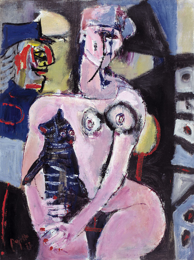 GUIDO PAJETTA Monza (Mi) 08/02/1898 - Milano 15/02/1987 Nudo con soriano e guardia di profilo, 1973 acrilico su tela cm.80x60, firma e anno in basso a sinistra, pubblicato su "Guido Pajetta, catalogo generale ragionato dei dipinti", volume secondo, 1964-1987, a cura di Enrico Crispolti, Edizioni Mazzotta, al numero 1973/81, pagina 1048.