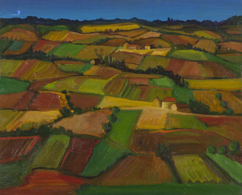 Vincenzo Balsamo, Brindisi 1935 - , Paesaggio Laziale 1965, Olio su tavola, cm. 39x49, Sul verso: firma, data e titolo; Etichetta: "Galleria ModenArte", Modena, , Autentica dell'Artista su foto.