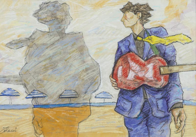 Giampaolo Talani, San Vincenzo 1955 - , L'ombra del chitarrista 2015, Tecnica mista su cartone, cm. 35x50, Firmato in basso a sinistra; Sul verso: firma, data e titolo; timbro "Oltre Mare Arte" e numero d'Archivio., , Autentica dell'Artista su foto.