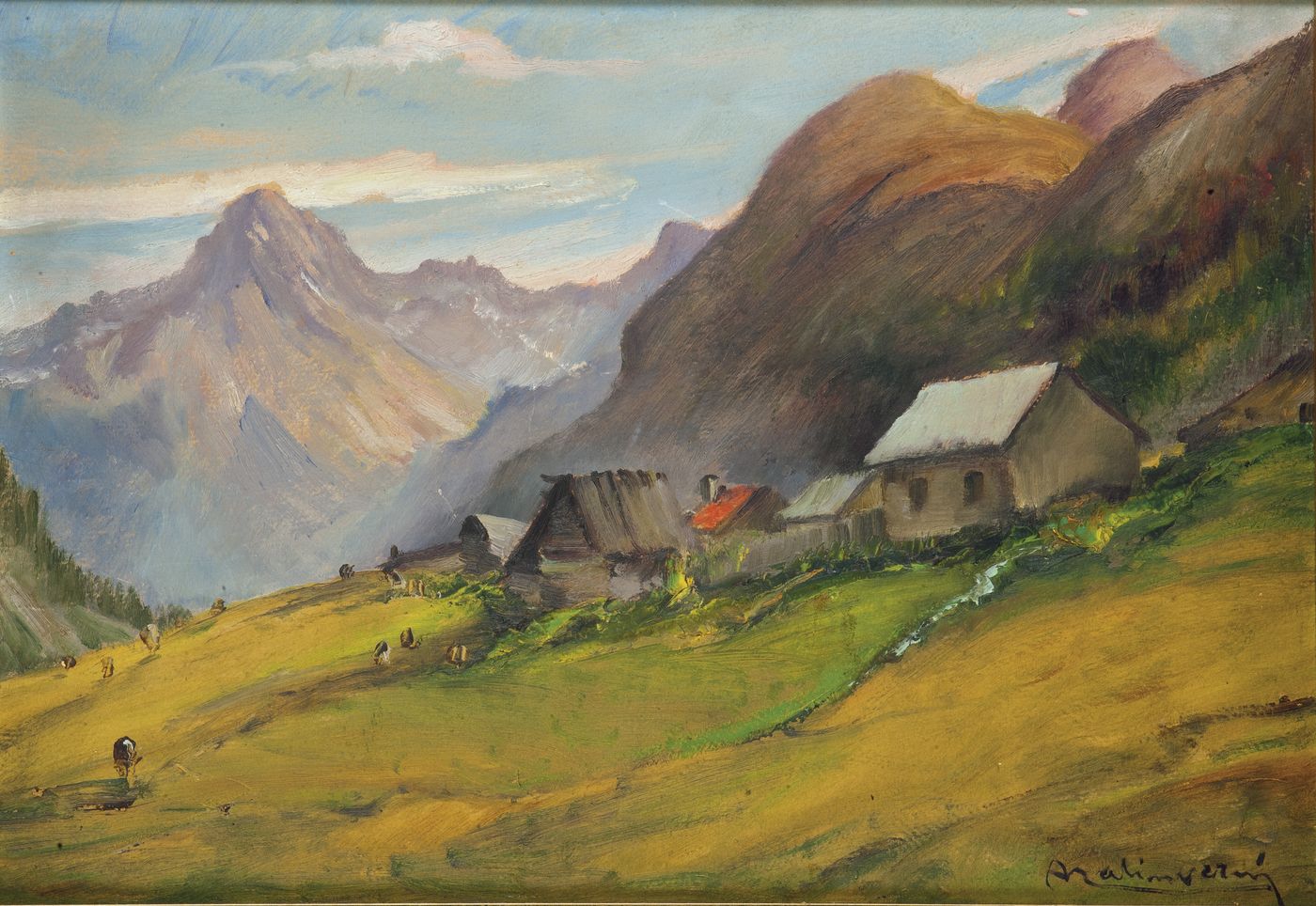 MALINVERNI ANGELO (Torino 1877 – 1947) - "Baite in montagna", 35x49,5olio su cartone. Opera firamata in basso a destra