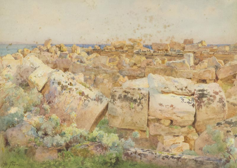 Alberto Pisa, Ferrara 1864 - Firenze 1936, The death Selinunte , Acquerello su cartone, cm. 27x36, Firmato in basso a sinistra; La carta presenta lievi fioriture dovute al tempo; Sul verso: Etichetta e Timbro di Provenienza., Bibliografia: Sicily, painted by Alberto Pisa, described by Spencer C. Musson, Adam & Charles Black, London, 1911 pag. 112 - 113, ripr. colori.,