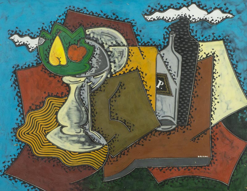 Pippo Oriani, Torino 1909 - Torino 1972, Fruttiera e bottiglia , Encausto su cartone, cm. 50x65, Firmato in basso a destra; Sul verso: Etichetta dell'Artista con descrizione e timbri di Autenticità. , , E- mail di conferma di Autenticità della Fonadione Oriani