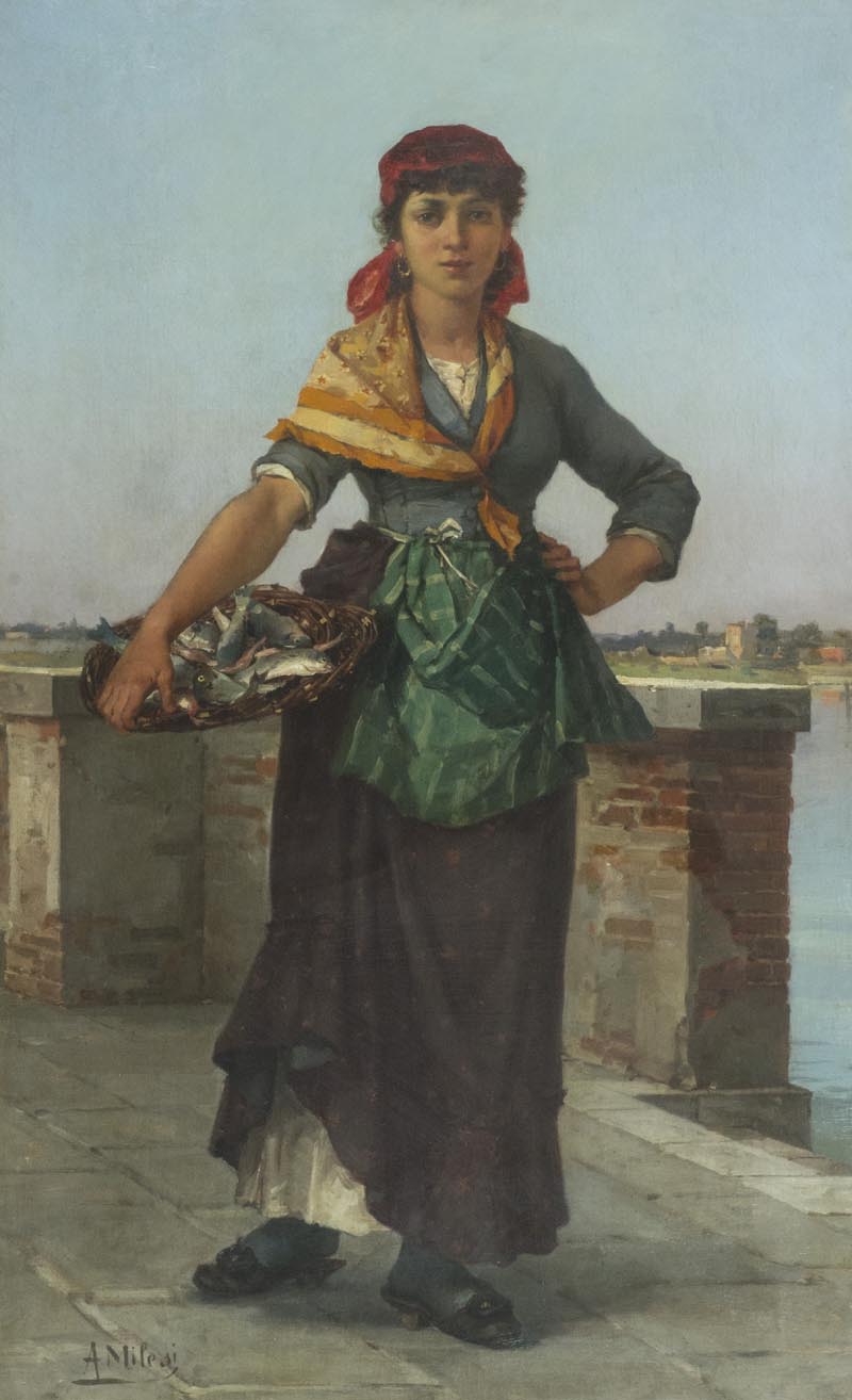 Alessandro Milesi, Venezia 1856 - 1945, Pescatrice , Olio su tela, cm. 89x56,...