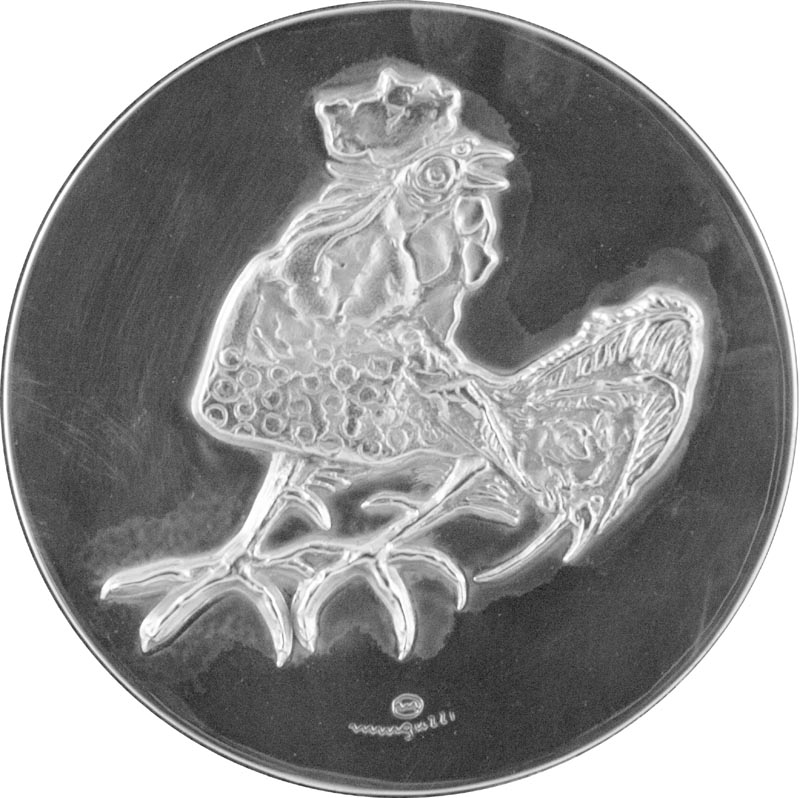 Luciano Minguzzi, Bologna 1911 - 2004, Gallo , Bassorilievo su lastra argentata, diametro cm. 20, es. multiplo, Firmato in basso al centro., ,