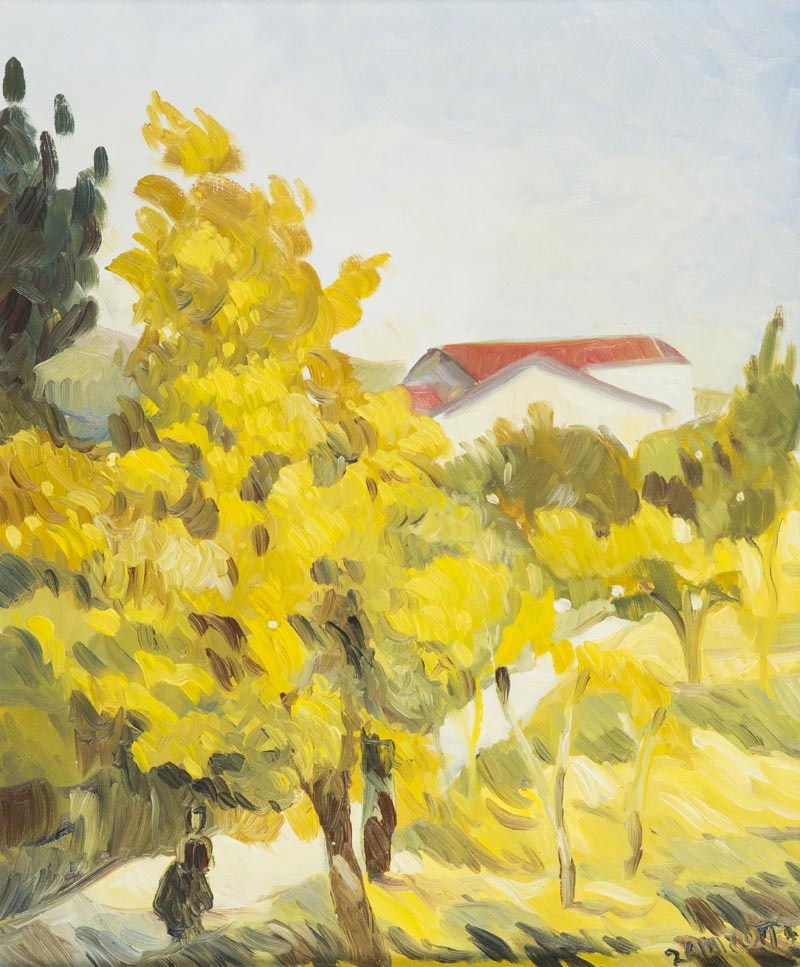 Corrado Zanzotto, Pieve di Soligo 1903 - 1980, Paesaggio con figura , Olio su...