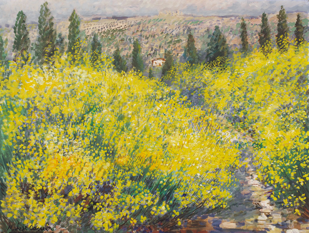 MICHELE CASCELLA Ortona (Ch) 07/09/1892 - Milano 27/08/1989 Ginestre in Toscana, 1973 olio su tela cm. 77x102, firma in basso a sinistra, dichiarazione d'autenticità dell'artista al retro, opera registrata presso l'Archivio Generale dell'Opera di Michele Cascella a cura della Torcular (MI) al numero 73/79 come da certificato con foto allegato.