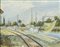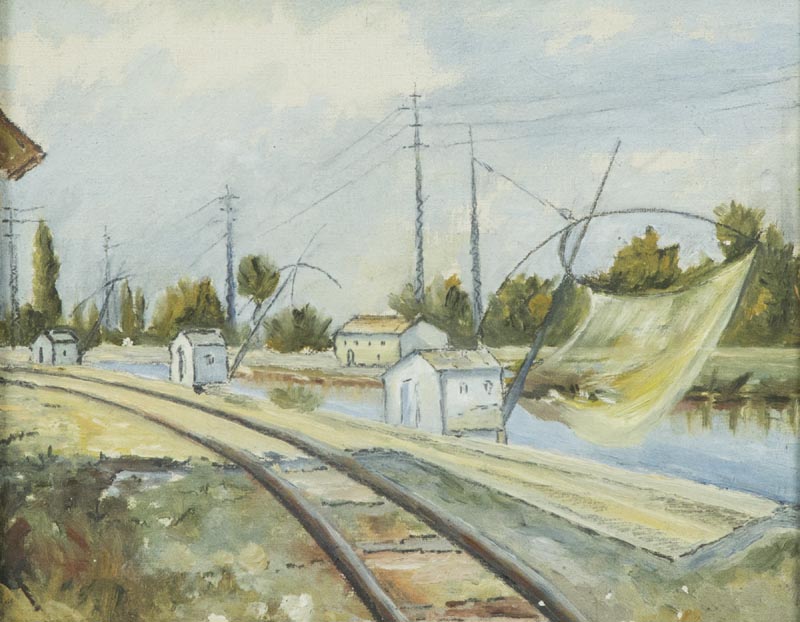 Domenico De Bernardi, Besozzo, Va 1892 - 1963, Paesaggio con bilancioni 1941, Olio su cartone telato, cm. 20x25, Sul verso: firma e data., ,