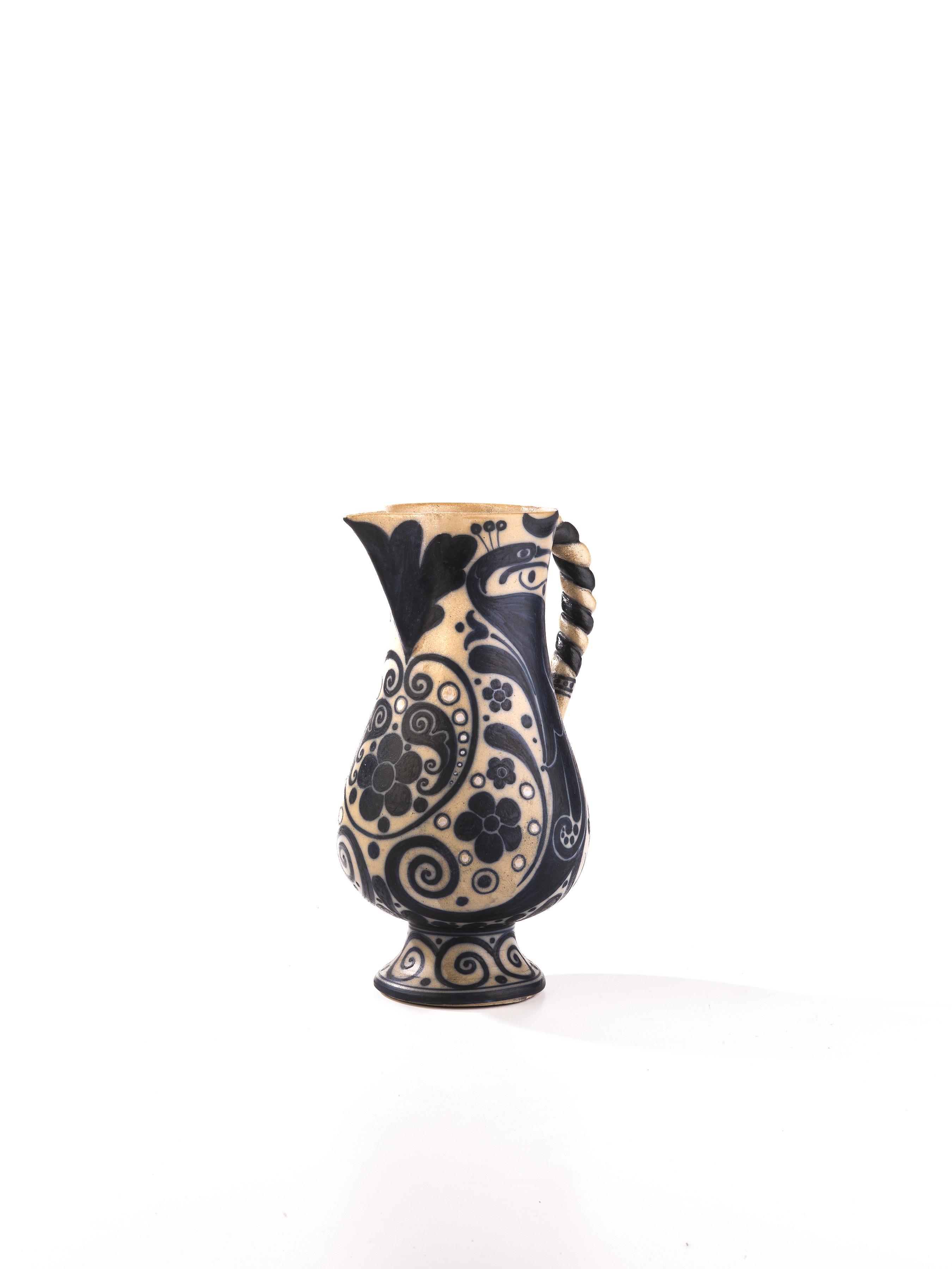Gres salato, corpo piriforme su alto piede circolare, ampio versatoio e ansa modellata a tortiglione; dipinto in blu scuro e piccoli tocchi di bianco su fondo naturale.