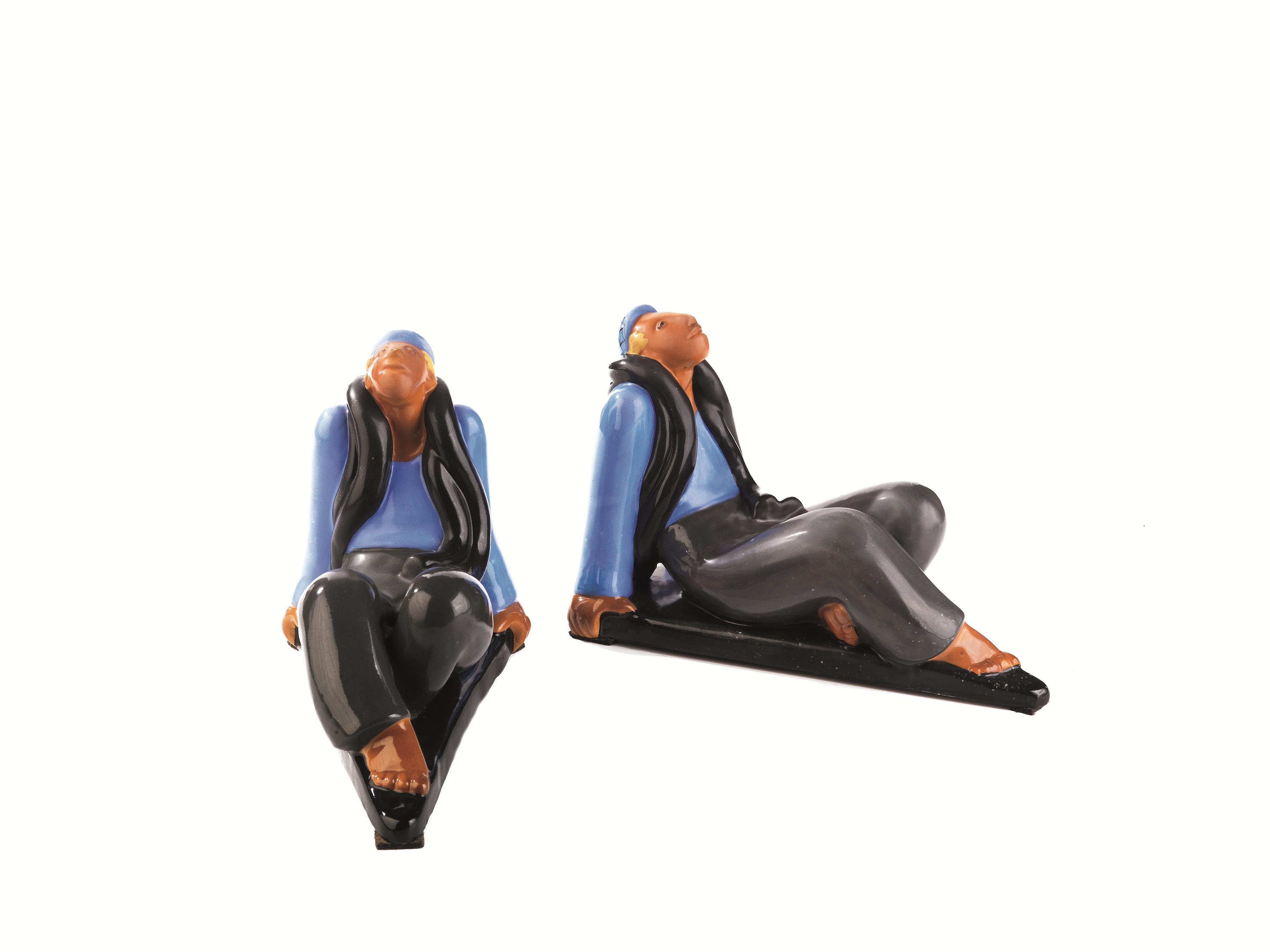 Coppia di sculture in maiolica policroma,