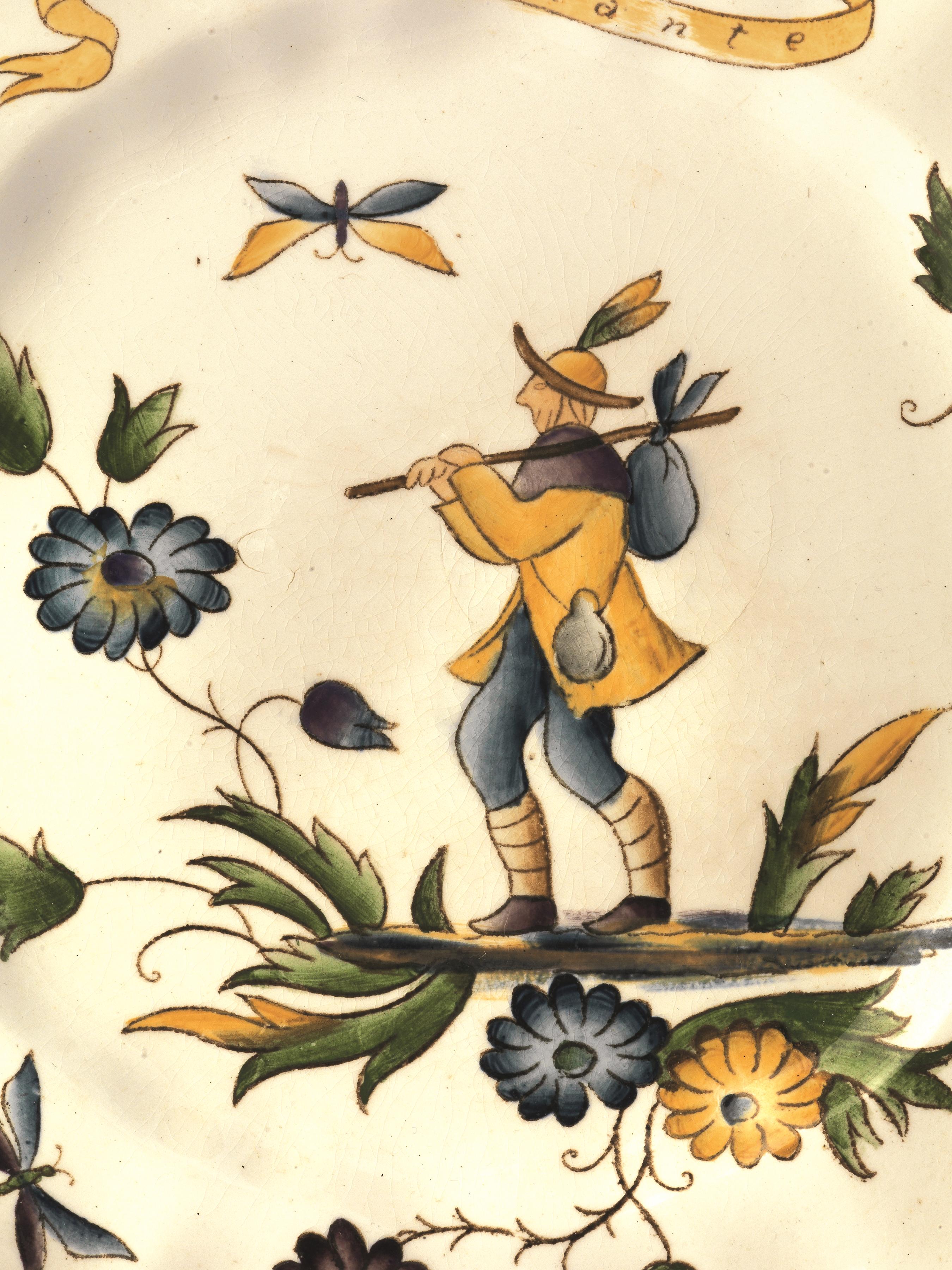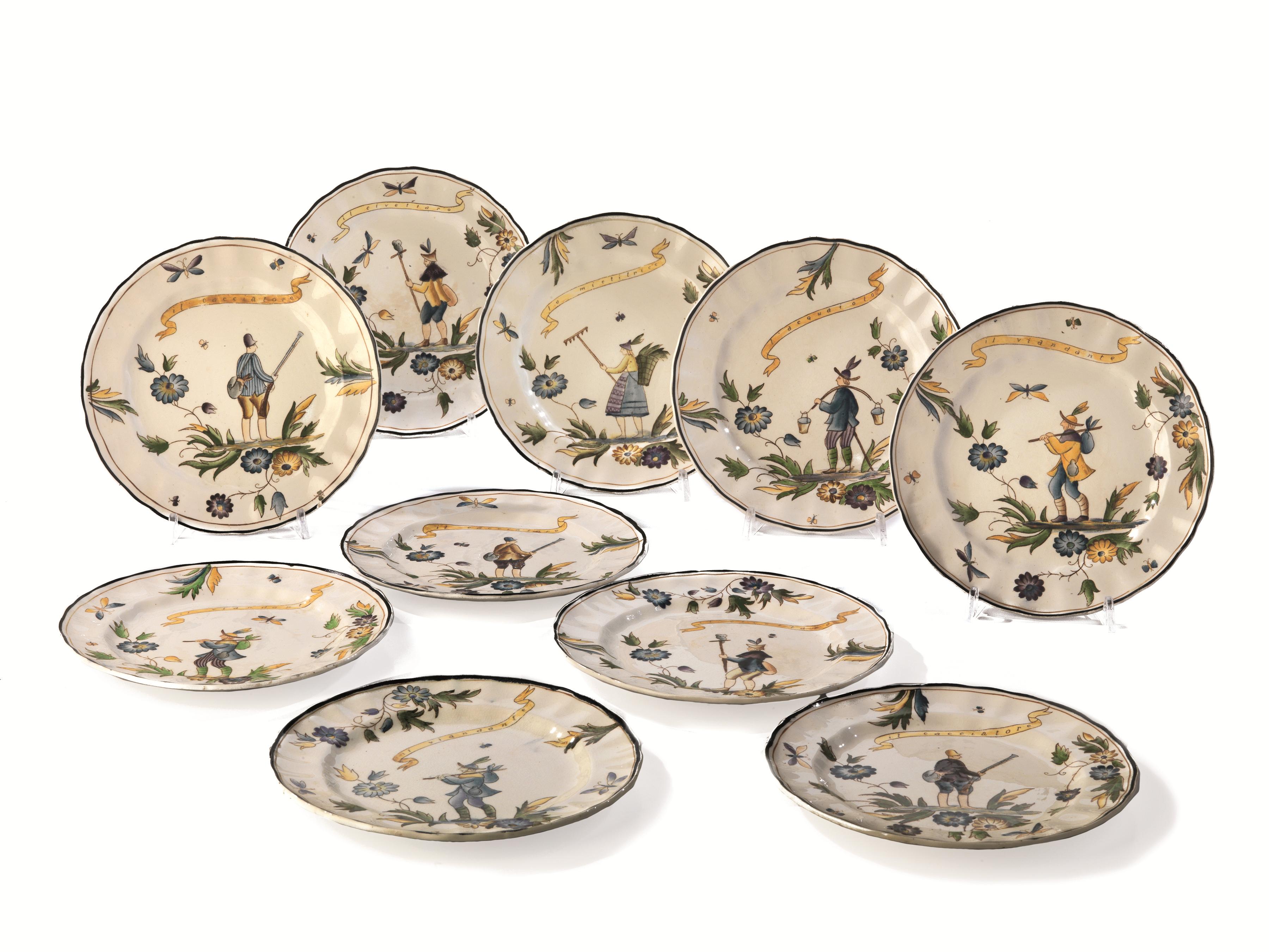 Dieci piatti in terraglia dipinti in policromia, decorati con i seguenti soggetti: il cacciatore, la mietitrice, il civettaro, il viandante, l’acquaiolo