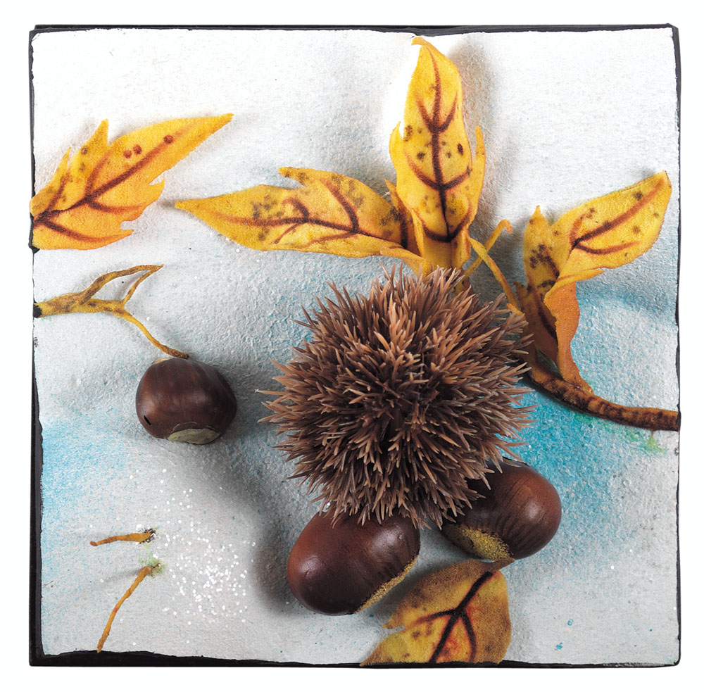 PIERO GILARDI Torino 03/08/1942 Castagne nella neve, 2002 poliuretano espanso cm. 20x20, firma e titolo al retro, dichiarazione d'autenticità dell'artista su foto, entro teca in plexiglass.