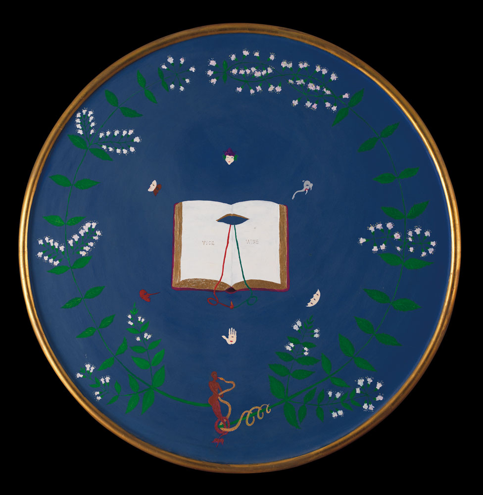 LUIGI ONTANI Vergato (Bo) 1943 Vice = Wise, 1988 olio su tavola circolare diametro cm. 75, firma, titolo, anno ed etichetta della Galleria Allegrini Arte (BS) al retro, dichiarazione d'autenticità dell'artista su foto.