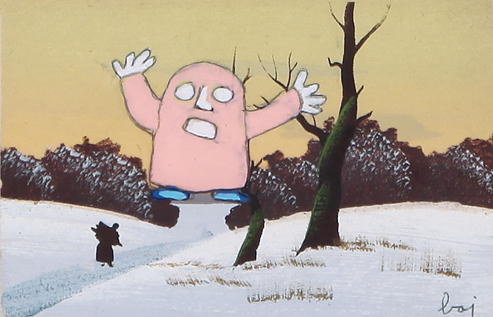 ENRICO BAJ Milano 31/10/1924 - Varese 15/06/2003 Ubu nella neve, 2000 cartolina postale con intervento dell'artista a tecnica mista (matita e tempera) cm. 9x14, firma in basso a destra, dichiarazione d'autenticità della moglie Roberta Cerini Baj su foto, l'opera è stata esposta nella mostra Enrico Baj De Los Habis, a cura di Alfred Jarry, tenutasi presso il Centro Julio Gonzales (Valenica - Spagna) dal 14/12/2000 al 18/02/2001.