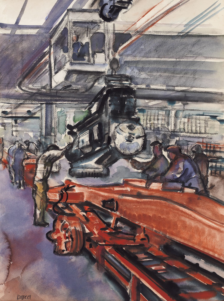 ANSELMO BUCCI Fossombrone (Ps) 29/11/1887 - Monza (Mi) 15/11/1965 Catena di montaggio tecnica mista su carta applicata su cartone cm. 78x59, firma in basso a sinistra, opera registrata presso l'Archivio Anselmo Bucci a cura della Galleria Antologia (Monza) come da dichiarazione su foto.
