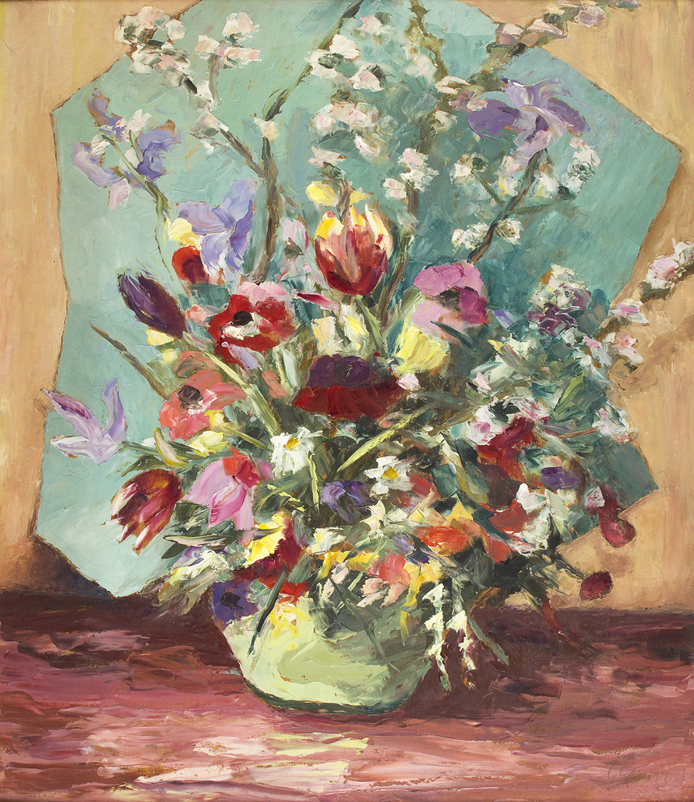 CESARINA GUALINO Casale Monferrato 1890 - Roma 1992 Vaso di fiori su fondo verde, 1956 Olio su tavola cm 69,5 x 60 Firma e data in basso a destra: C Gualino 56