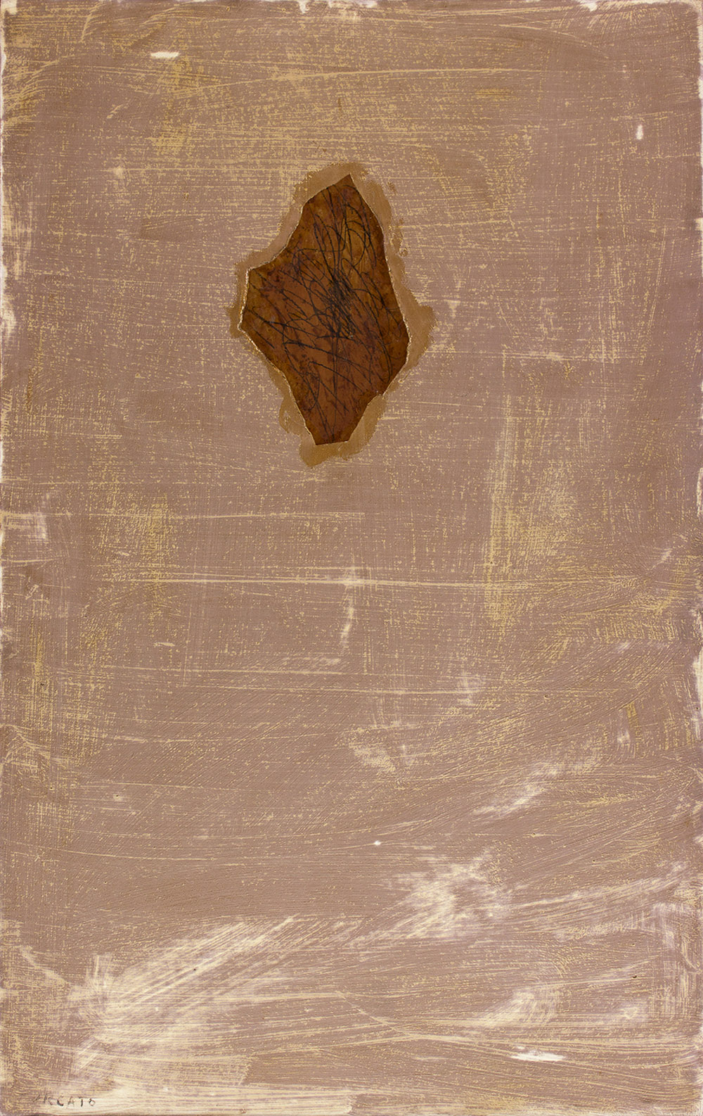 GIULIO TURCATO Mantova 1912 – Roma 1995 Tatuaggio Olio e collage di pelle su tela cm 120 x 75,5 Firma in basso a sinistra: TURCATO Etichetta al retro: IV Biennale Internazionale d’Arte della Repubblica di San Marino del 1963 Collezione Quinti ed Eredi