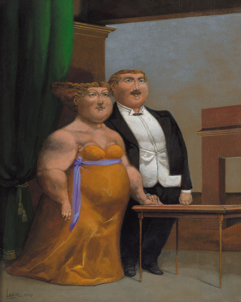 CARLOS JOSE’ LEDDA Malagueno (Argentina) 1932 Comprometidos, 2005 olio su tela cm. 50x40, firma e anno in basso a sinistra, firma, titolo, anno e archivio numero D 23 G al retro, dichiarazione d'autenticità dell'artista e archivio numero D 23 G a cura di Renato Alberici su foto.