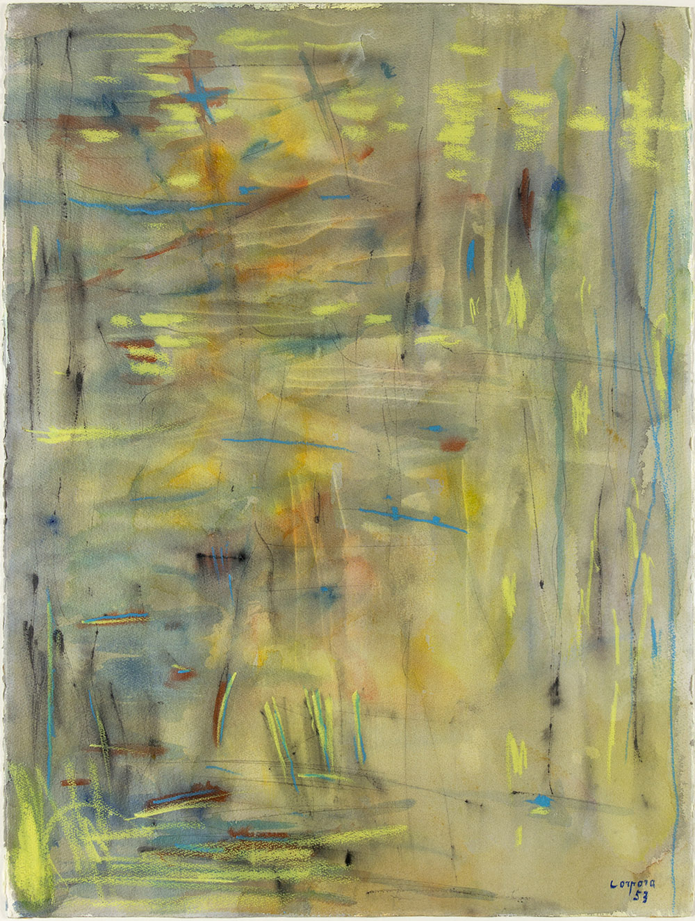 ANTONIO CORPORA Tunisi 1909 - Roma 2004 Senza titolo, 1953 Acquerello e pastello su carta cm 76 x 56 (in cornice) Firma in basso a destra: Corpora 53 Pubblicazioni Antonio Corpora - Catalogo generale ragionato degli acquarelli, a cura di Floriano De Santi, Ed. Giovanni Di Summa 2004, vol. I, fig. 9, pag. 38 Autentica dell’Archivio Corpora, opera pubblicata nel I Volume del Catalogo Generale