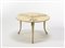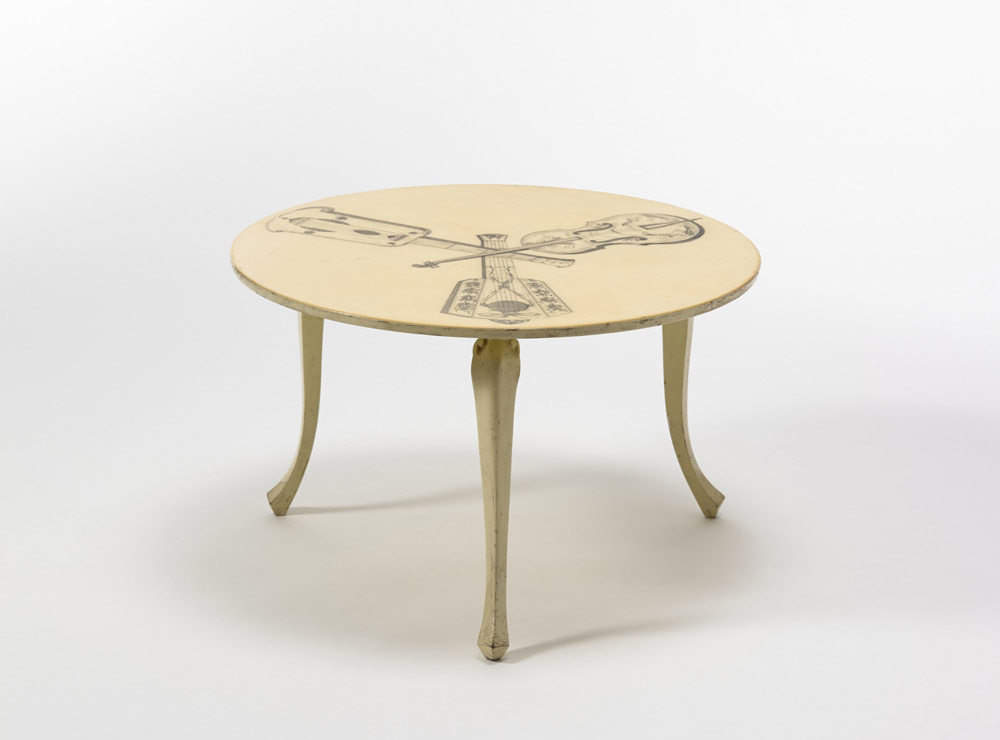 Tavolino da caffè in legno decorato con strumenti a corda. Produzione italiana anni 70 (d cm 70x43,5) (difetti)