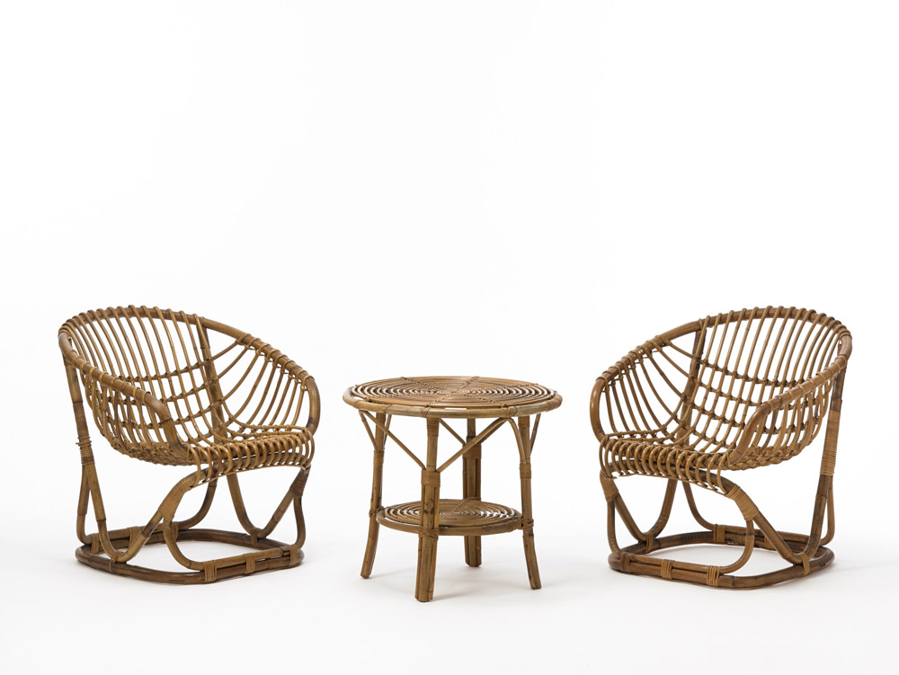 Tito Agnoli (1931) - Lotto composto da due sedie unite ad un tavolino. Esecuzione Pierantonio Bonacina, Lurago d'Erba, 1936 ca.. Malacca e giunco (cm 70x80x70)