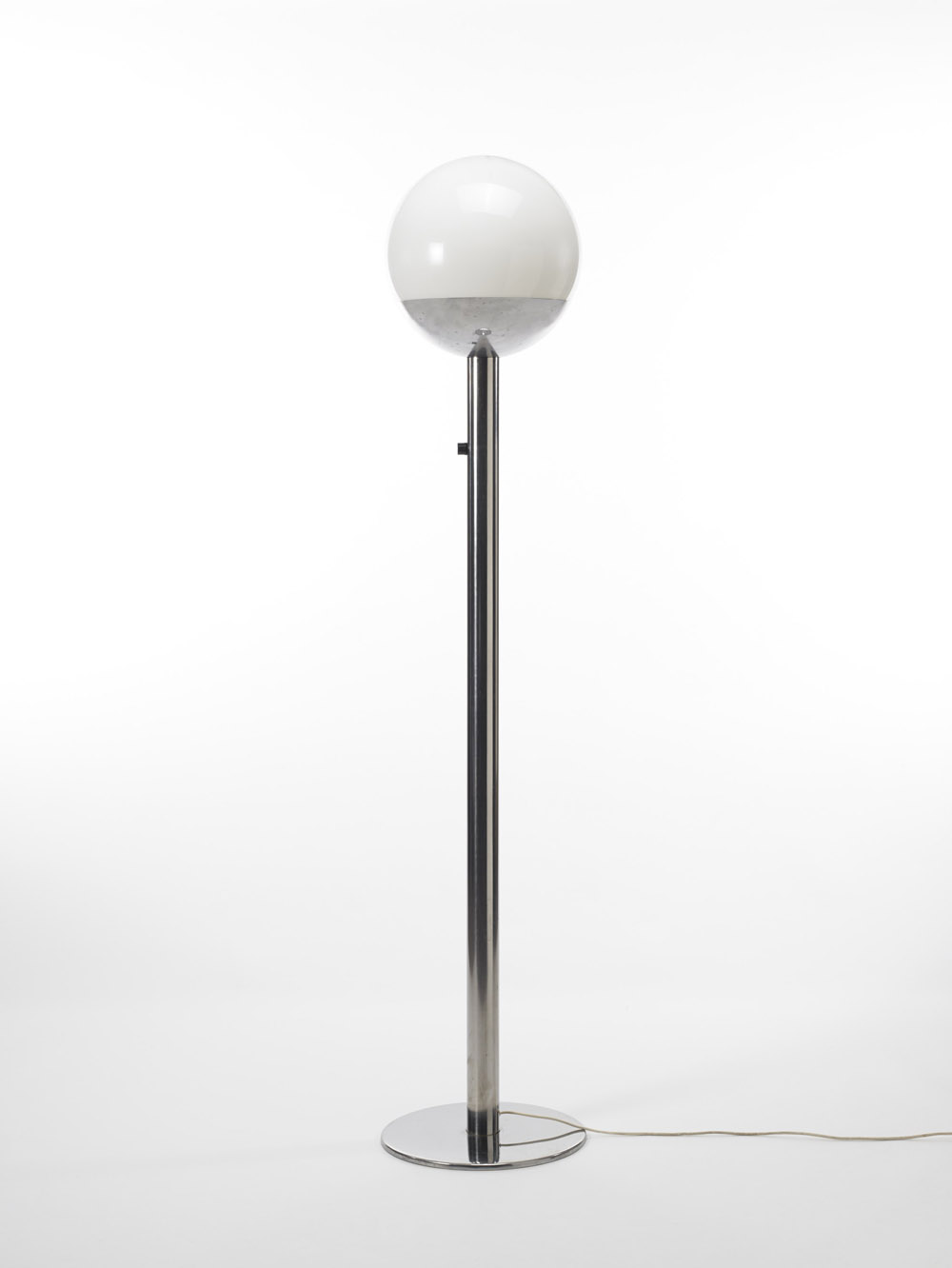 Lampada da terra modello "P428" Produzione Luci, Italia anni 70. Acciaio cromato e diffusore sferico in vetro opalino.(h cm 175)