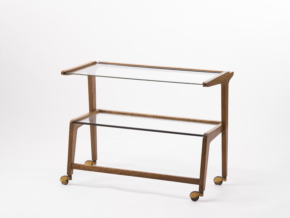 Carrello portavivande a due ripiani in cristallo con gambe munite di rotelle. Italia, 1940 circa