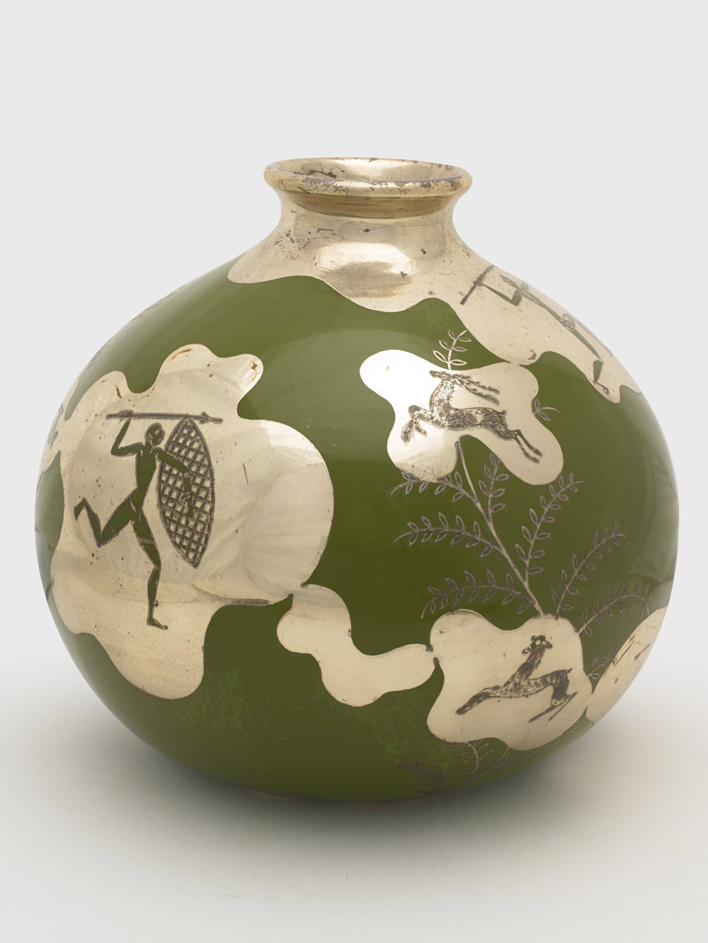Arrigo Finzi (1890 - 1973) - Manifattura Arte -Argenterie d'Italia, 1930 circa. Vaso di forma globulare in ceramica verde, decorato con lamina d'argento con motivi ispirati all'arte africana (h cm 25) (difetti)