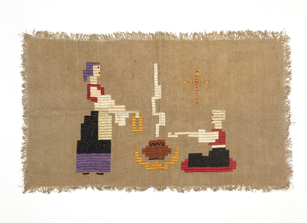 Manifattura sarda - Ricamo in seta policroma con punto lanciato su canovaccio di carta color corda. Scena domestica al focolare con simbolo della croce. personaggi abbigliati nei tipici costumi sardi (cm 68x40)(difetti) Provenienza: Collezione privata