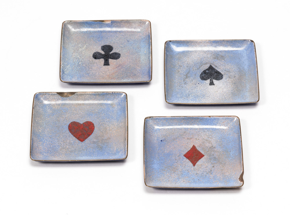 Paolo De Poli (Padova 1905 - 1966) - Lotto di quattro posaceneri in rame smaltato raffiguranti i semi delle carte. Marchio "De Poli" sotto la base (cm 8,5x8,5) (difetti e sbeccature)