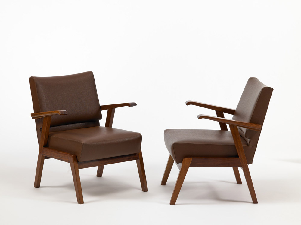 Coppia di poltroncine con braccioli in legno teak massello rivestite in similpelle. Trieste, anni 40