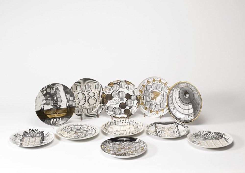 Piero Fornasetti (Milano 1913 - 1988) - gruppo di undici piatti in porcellana litografata in nero e oro della serie "Calendario" dal 1978 al 1992. Marcati e numerati al verso (d cm 24)