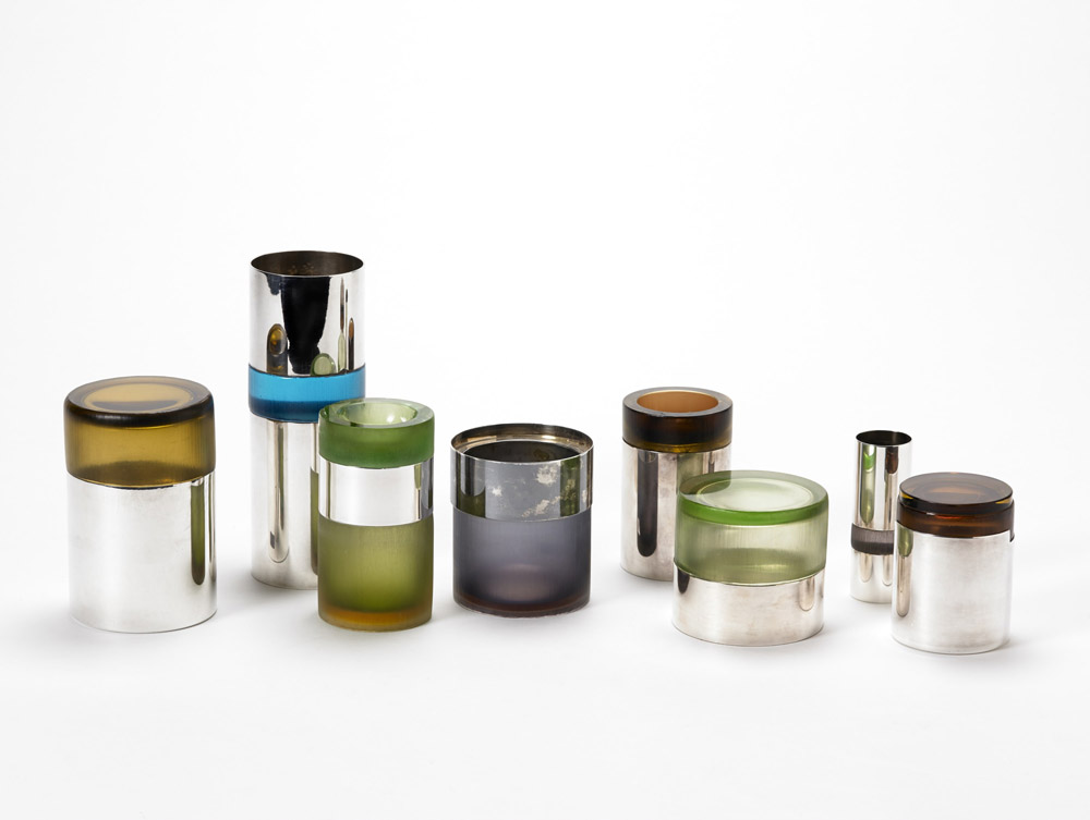 Massimo Vignelli (1931 - 2014) - Gruppo di otto contenitori cilindrici in ottone argentato e vetro trasparente di diversi colori, rifinito con leggere molature verticali. Alcuni esemplari recano marchi a incussione "Sabattini" e "Christofle Gallia" sulla parte in metallo, e/o la firma all'acido "Venini Murano Italia" sul vetro. Italia, anni 60 (misure diverse) (difetti e mancanze) Bibliografia: "Domus", luglio 1963, pp. 39-40 Provenienza: Collezione privata Lino Sabattini