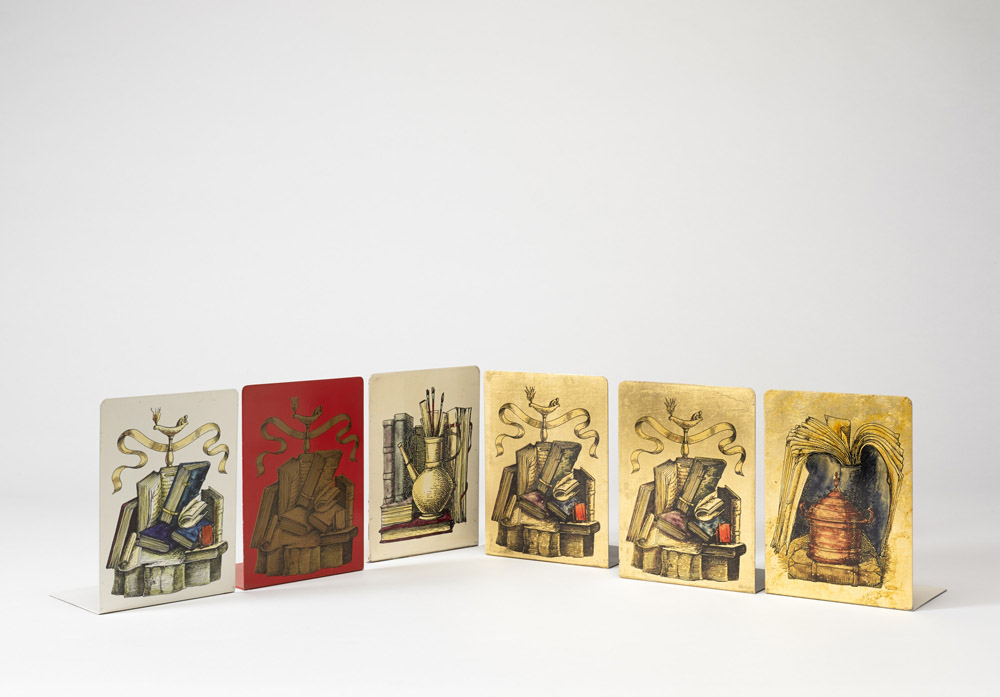 Lotto di sei reggilibri in metallo con diversi decori. Marcati sotto la base, Galbiati - Milano - Made in Italy