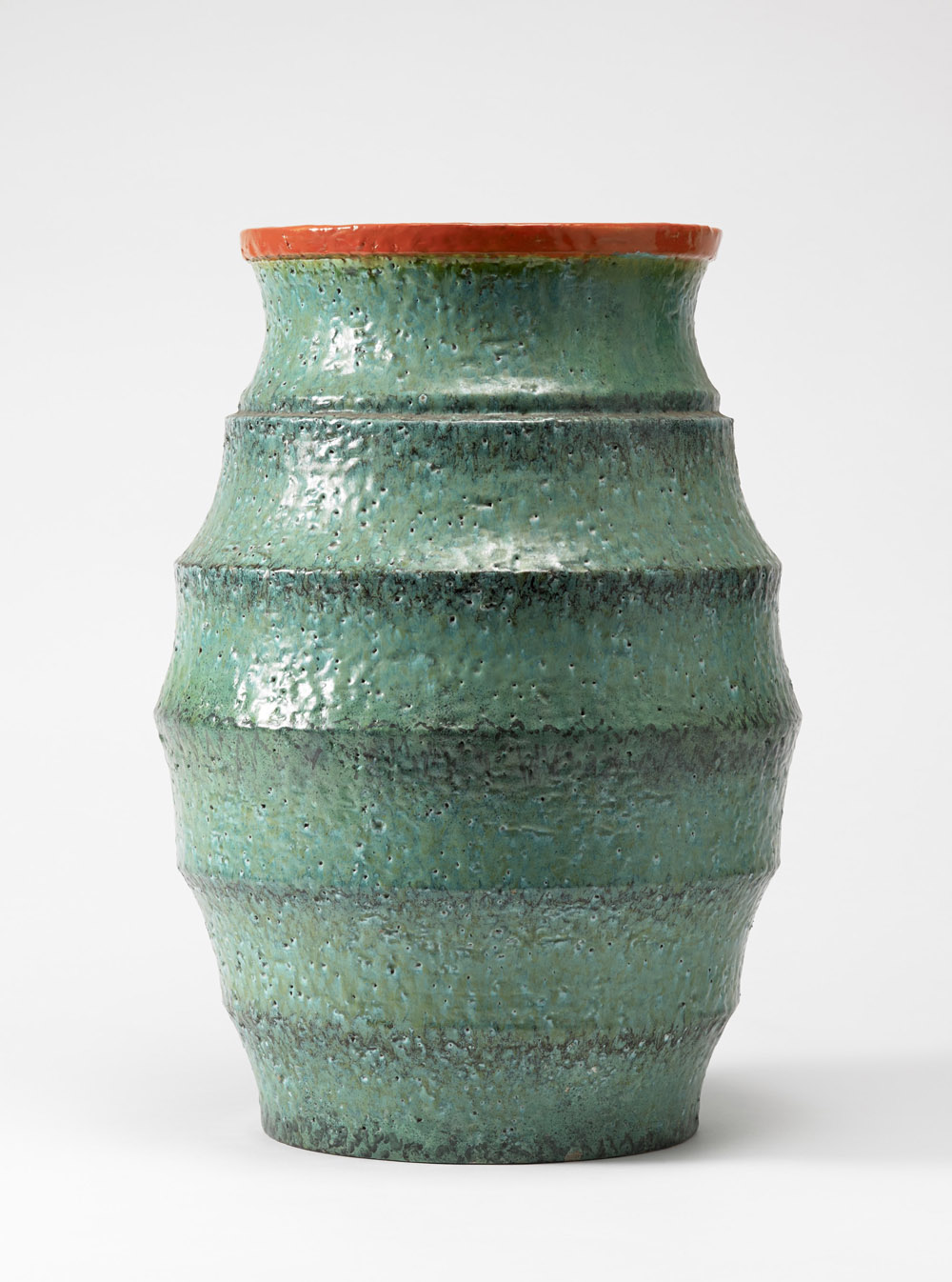 Giuseppe Mazzotti - (attribuito) Grande vaso di gusto futurista, in ceramica modellata a fasce orizzontali concave e smaltata in verde e arancio. Manifattura M.G.A. Albisola Marina, anni 30. Marcato sotto la base "M.G.A." (h cm 56) (leggeri restauri - integrazioni cromatiche)