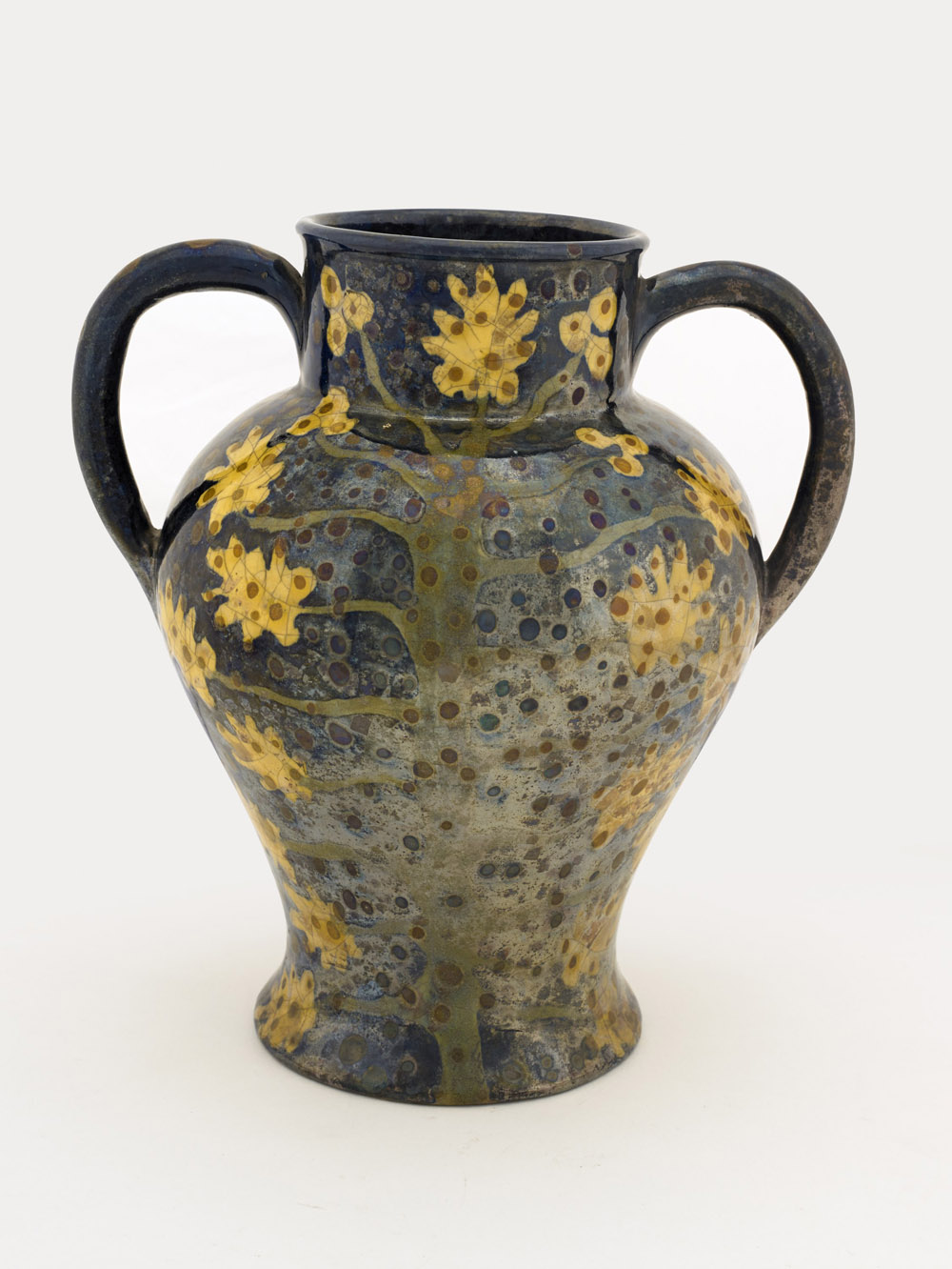 Pietro Melandri (Faenza 1885 - 1976) - Vaso a balaustro biansato in ceramica decorata con smalti policromi e lustri metallici sottovetrina nei troni blu, verde giallo, ocra. Decoro floreale. Firmato sotto la base in ocra "FM Melandri" e con monogramma dell'astore. (h cm 25) Bibliografia per esemplare simile cfr: E. Gaudenzi, Pietro Melandri (1885-1976), Gruppo Faenza Editrice, Faenza 2002, p. 105.