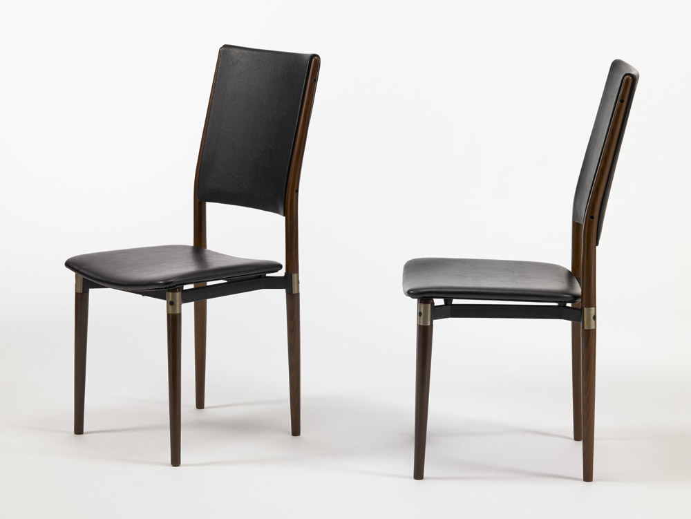 Eugenio Gerli (Milano 1923) - Coppia di sedie modello "S81". Produzione Tecno,1958. Alluminio pressofuso, palissandro indiano e pelle nera. Le sedie presentano lievi difetti