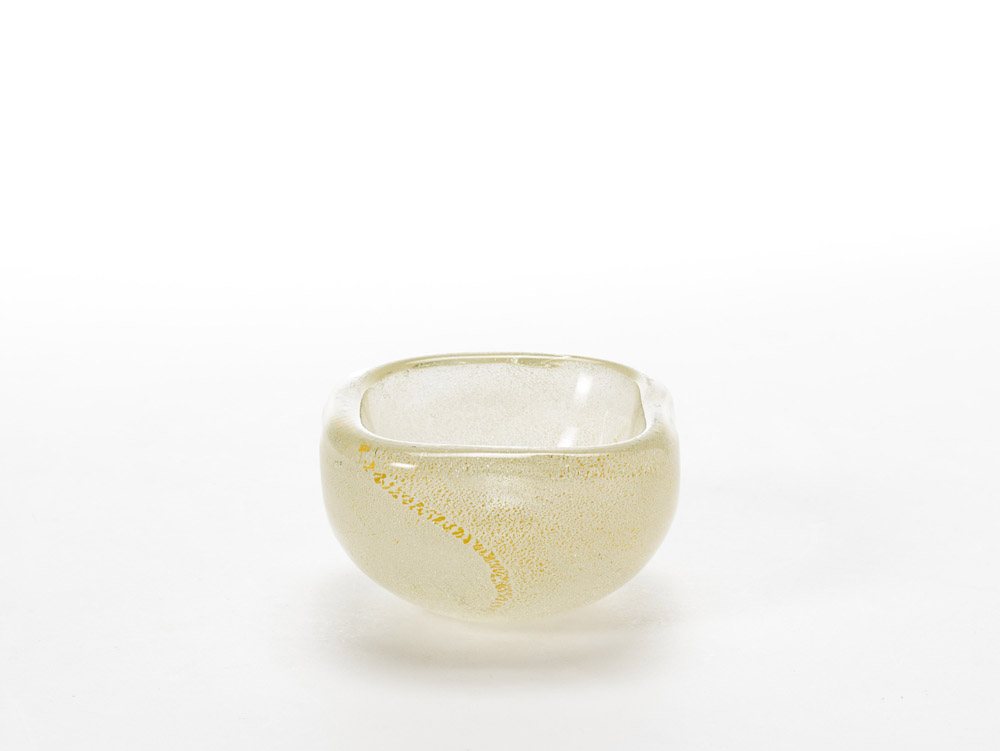 Carlo Scarpa (Venezia 1906 - Sendai 1978) - Piccola coppa a sezione quadrangolare e base rotonda in vetro sommerso incolore a bollicine con inclusione di foglia d'oro. Forma analoga al disegno n. 3510 del catalogo Blu Venini. Firmata all’acido "Venini Murano", 1935 ca. (cm 10x6x10) Bibliografia: M. Barovier, Carlo Scarpa. Venini 1932-1947. Skira, Milano 2012, p. 194.