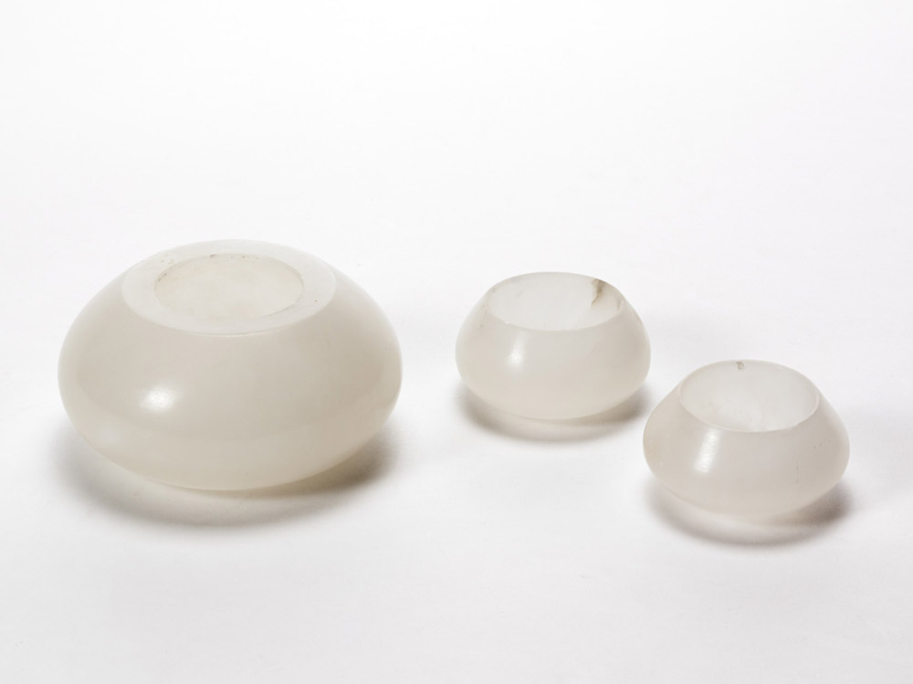Angelo Mangiarotti (1921 - 2012) - Gruppo di tre ciotole in alabastro scaglione. Esecuzione Cooperativa Artieri Alabastro Volterra, 1982(d cm 15 e 12) (lievissimi difetti) Fonti archivistiche: Disegno tecnico con cartiglio "Angelo Mangiarotti architetto" datato 08/07/1982. Eliocopia. Collezione privata, Cantù.