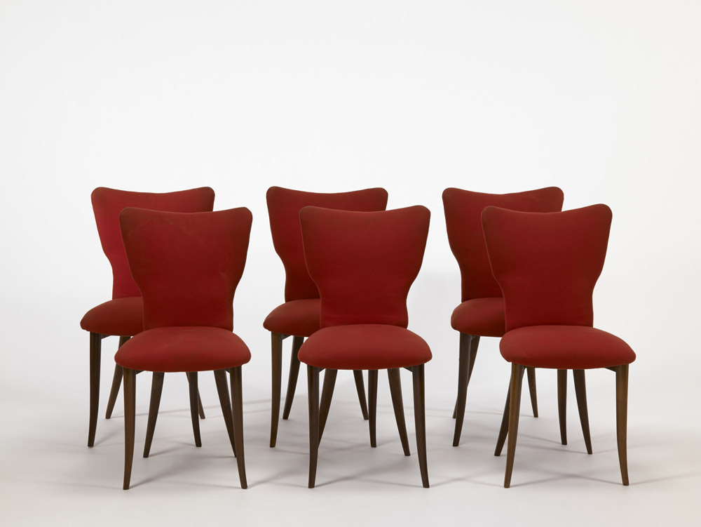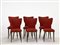 Sei sedie in mogano con seduta e schienale rivestiti in tessuto rosso. Esecuzione italiana anni 50.