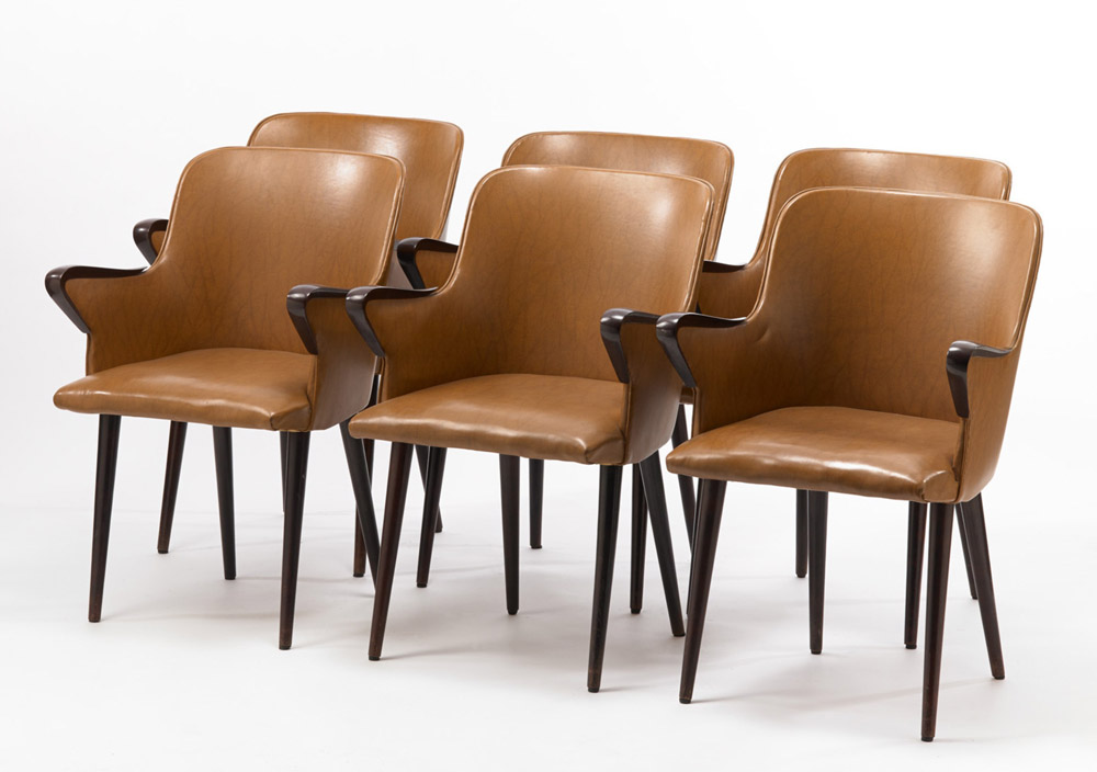 Osvaldo Borsani (1911 - 1985) - Sei poltroncine "P38", produzione Tecno, Varedo 1954 Struttura in legno, rivestimento in skai beige. (difetti all'imbottitura) Bibliografia: Tecno. L'eleganza discreta della tecnica, a cura di G. Bosoni, Skira, Milano 2011, pp. 64.