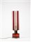 Venini. Lampada da tavolo in vetro soffiato trasparente rosso con diffusore a fasce verticali, acidato sulla superficie interna. Firmato all'acido "Venini, Murano Italia". Murano anni 40 (h cm 52)