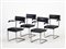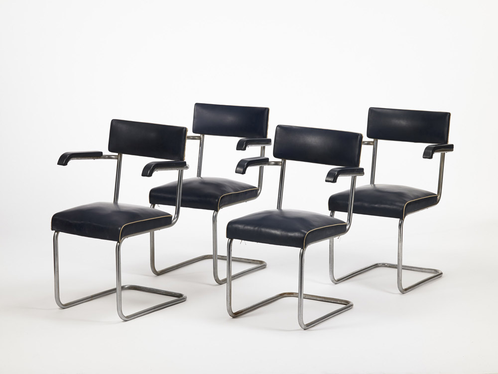 Ufficio Tecnico Columbus, modello "18 C". Lotto di quattro poltroncine con struttura in tubolare metallico piegato e rivestite in skai blu con filettature bianche. Milano, 1933 (difetti) Bibliografia: Mobili razionali Columbus, 1936. Pieghevole pubblicitario Flessibili Splendori, I mobili in tubolare metallico. Il caso Columbus a cura di A. Pansera, Electa, Milano 1998