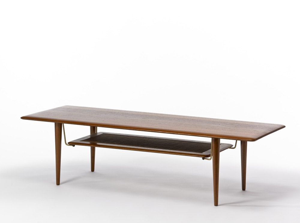 Peter Hvidt (1916 - 1986) - e Orla Mølgaard-Nielsen - Tavolo da salotto modello "F516". Produzione France & Son, Danimarca, 1965 ca. Teak, ottone e rattan. Marchiato e numerato. (lievi difetti)